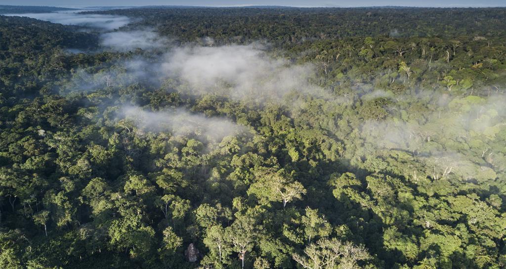 A blanket of clouds settles atop the park’s vast canopy of mahogany, ebony and okoumé trees