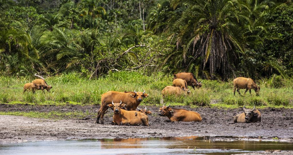 The park’s baïs – swampy forest clearings – draw the elusive forest buffalo into the open