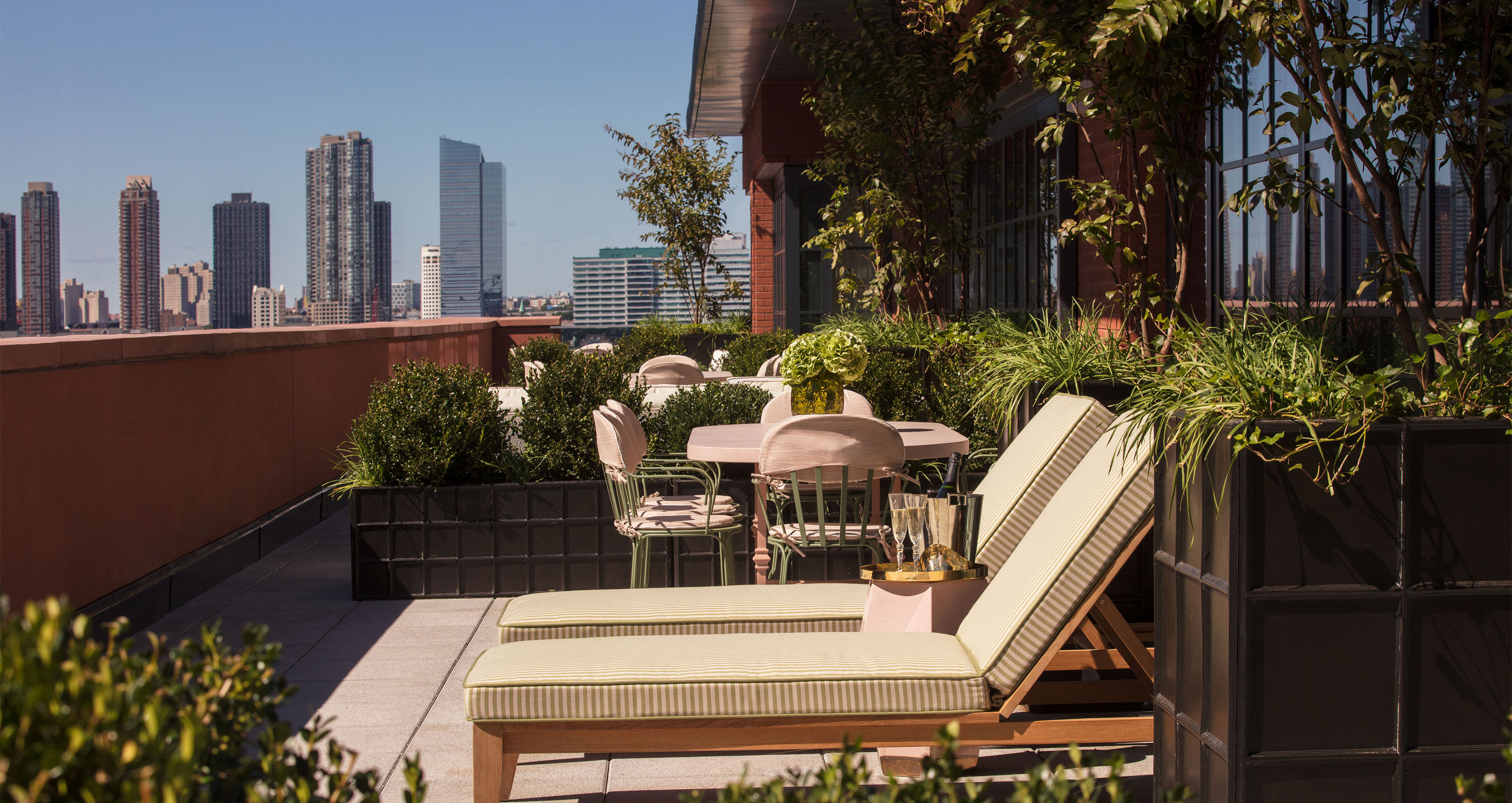 The hotel’s 97 guest rooms – including the two-storey Le Grand Appartement Terrasse – are plush, light-flooded visions in lavender, outfitted with elegant Deco-inspired furniture and intriguing custom wallpaper depicting scenes from Tribeca (like a pigeon carrying a croissant or women donning Birkin bags). Likewise melding French joie de vivre with the eclectic vibe of the neighbourhood is the hotel’s Fouquet’s New York. Decked out in shades of red and black, the chandelier-lit eatery does its legendary Parisian namesake proud, thanks in part to the visionary culinary stylings of Michelin-gilded chef Pierre Gagnaire, who adds a subtle New York twist to classic brasserie fare from steak tartare and escargots to sole meunière and onion soup. The heady scene is furthered at the speakeasy-style Titsou Bar, modelled after the Bar Marta at the group’s Paris location, and the Par Ici Café, which serves delectable veggie-focused dishes in a glassed-in courtyard.